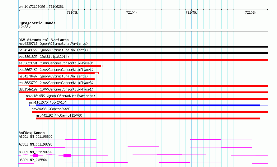 Variant DetailsVariant: esv2665226| Internal ID | 9584645 | | Landmark | | | Location Information | | | Cytoband | 10q22.1 | | Allele length | | Assembly | Allele length | | hg38 | 4186 | | hg19 | 4186 |