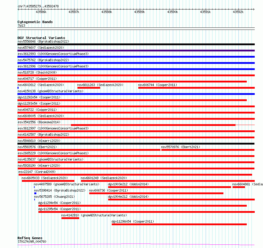 Variant DetailsVariant: esv2665229 | Internal ID | 9931334 | | Landmark | | | Location Information | | | Cytoband | 7p13 | | Allele length | | Assembly | Allele length | | hg38 | 7200 | | hg19 | 7200 |
