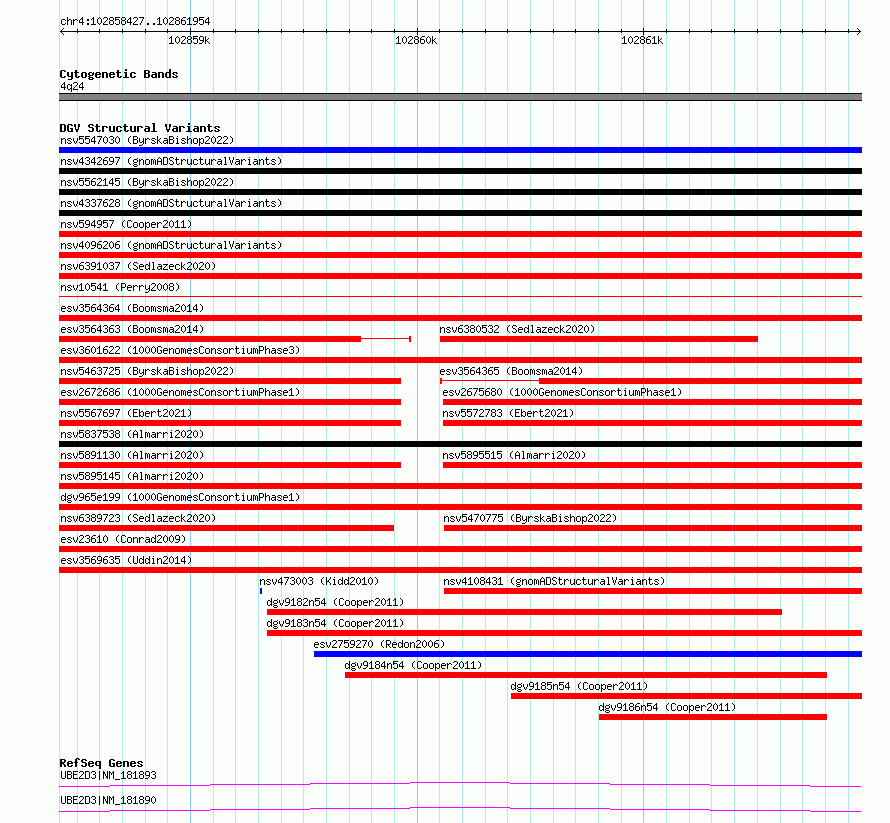 | | Variant Type | CNV deletion | | Copy Number | | | Allele State | | | Allele Origin | | | Probe Count | | | Validation Flag | | | Merged Status | M | | Merged Variants | dgv965e199 | | Supporting Variants | essv5950367, essv5755929, essv6322407, essv6414244, essv6309895, essv5425593, essv5659092 | | Samples | NA20795, NA19782, HG00253, NA20530, HG00259, NA12830, NA11843 | | Known Genes | UBE2D3 | | Method | Merging | | Analysis | No reference, merging analysis | | Platform | Merging | | Comments | | | Reference | 1000_Genomes_Consortium_Phase_1 | | Pubmed ID | 23128226 | | Accession Number(s) | esv2665471