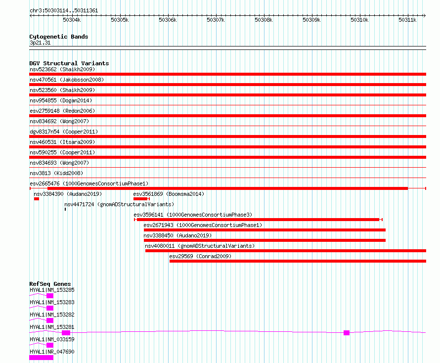 Variant DetailsVariant: esv2665476| Internal ID | 9584895 | | Landmark | | | Location Information | | | Cytoband | 3p21.31 | | Allele length | | Assembly | Allele length | | hg38 | 8248 | | hg19 | 8248 |