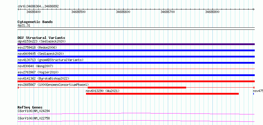 Variant DetailsVariant: esv2665867| Internal ID | 9931972 | | Landmark | | | Location Information | | | Cytoband | 6p21.31 | | Allele length | | Assembly | Allele length | | hg38 | 529 | | hg19 | 529 |
