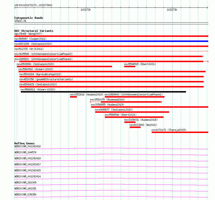 Variant DetailsVariant: esv2665920| Internal ID | 9932025 | | Landmark | | | Location Information | | | Cytoband | 14q32.31 | | Allele length | | Assembly | Allele length | | hg38 | 2239 | | hg19 | 2239 |