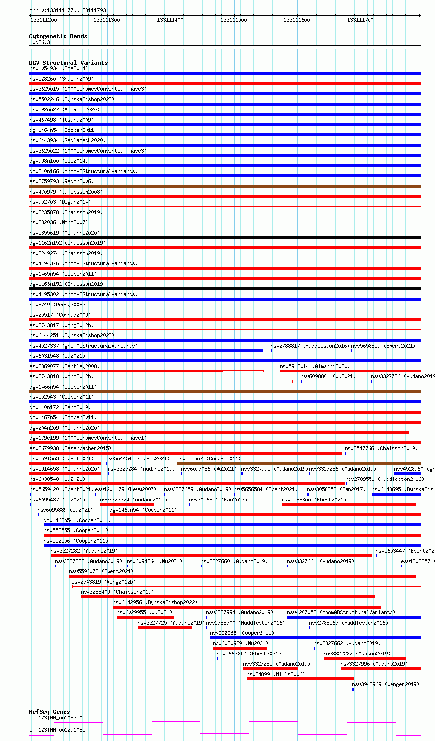 Variant DetailsVariant: esv2666117 | Internal ID | 9932222 | | Landmark | | | Location Information | | | Cytoband | 10q26.3 | | Allele length | | Assembly | Allele length | | hg38 | 617 | | hg19 | 617 |