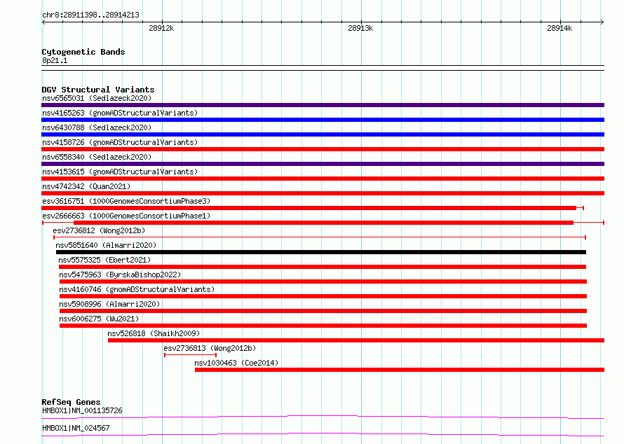 Variant DetailsVariant: esv2666663| Internal ID | 9932768 | | Landmark | | | Location Information | | | Cytoband | 8p21.1 | | Allele length | | Assembly | Allele length | | hg38 | 2816 | | hg19 | 2816 |