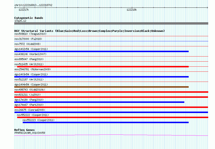 Variant DetailsVariant: esv26675 | Internal ID | 11390594 | | Landmark | | | Location Information | | | Cytoband | 10q26.12 | | Allele length | | Assembly | Allele length | | hg38 | 1790 | | hg19 | 1790 | | hg18 | 1790 |