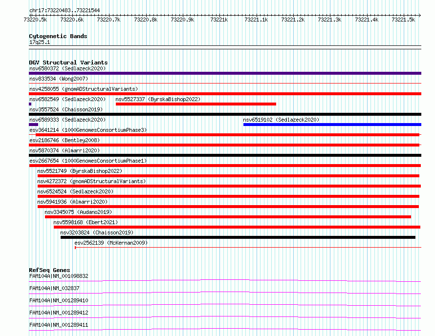 Variant DetailsVariant: esv2667654| Internal ID | 9933759 | | Landmark | | | Location Information | | | Cytoband | 17q25.1 | | Allele length | | Assembly | Allele length | | hg38 | 1062 | | hg19 | 1062 |