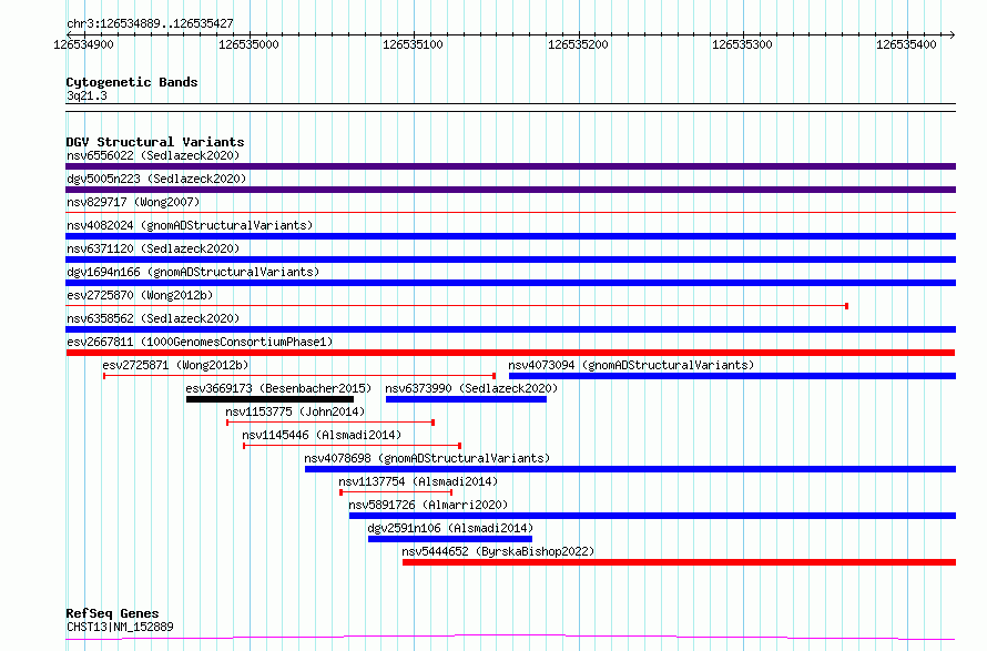 Variant DetailsVariant: esv2667811| Internal ID | 9933916 | | Landmark | | | Location Information | | | Cytoband | 3q21.3 | | Allele length | | Assembly | Allele length | | hg38 | 539 | | hg19 | 539 |