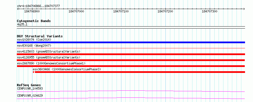 Variant DetailsVariant: esv2667890 Internal ID | 9587309 | Landmark | | Location Information | | Cytoband | 4q35.1 | Allele length | Assembly | Allele length | hg38 | 512 | hg19 | 512 |