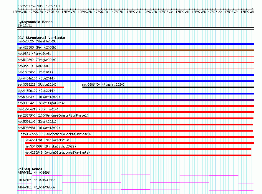 | | Variant Type | CNV deletion | | Copy Number | | | Allele State | | | Allele Origin | | | Probe Count | | | Validation Flag | | | Merged Status | M | | Merged Variants | | | Supporting Variants | essv6339848, essv6208545 | | Samples | NA19338, HG01190 | | Known Genes | ATP6V1E1 | | Method | Merging | | Analysis | No reference, merging analysis | | Platform | Merging | | Comments | High quality site | | Reference | 1000_Genomes_Consortium_Phase_1 | | Pubmed ID | 23128226 | | Accession Number(s) | esv2667900