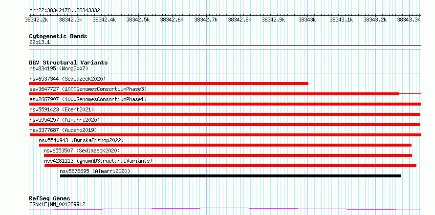 Variant DetailsVariant: esv2667907| Internal ID | 9934012 | | Landmark | | | Location Information | | | Cytoband | 22q13.1 | | Allele length | | Assembly | Allele length | | hg38 | 1155 | | hg19 | 1155 |