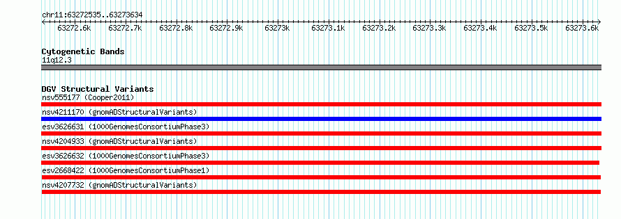 Variant DetailsVariant: esv2668422| Internal ID | 9587841 | | Landmark | | | Location Information | | | Cytoband | 11q12.3 | | Allele length | | Assembly | Allele length | | hg38 | 1100 | | hg19 | 1100 |