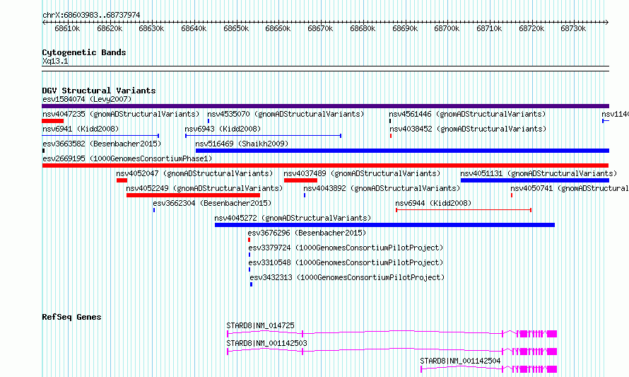 | | Variant Type | CNV deletion | | Copy Number | | | Allele State | | | Allele Origin | | | Probe Count | | | Validation Flag | | | Merged Status | M | | Merged Variants | | | Supporting Variants | essv5479451, essv6222003, essv6552522, essv6498164, essv5989813 | | Samples | NA19397, NA18917, NA19395, NA19375, NA19376 | | Known Genes | STARD8 | | Method | Merging | | Analysis | No reference, merging analysis | | Platform | Merging | | Comments | High quality site | | Reference | 1000_Genomes_Consortium_Phase_1 | | Pubmed ID | 23128226 | | Accession Number(s) | esv2669195