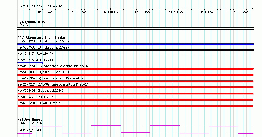 Variant DetailsVariant: esv2670224| Internal ID | 9936329 | | Landmark | | | Location Information | | | Cytoband | 2q24.2 | | Allele length | | Assembly | Allele length | | hg38 | 727 | | hg19 | 727 |