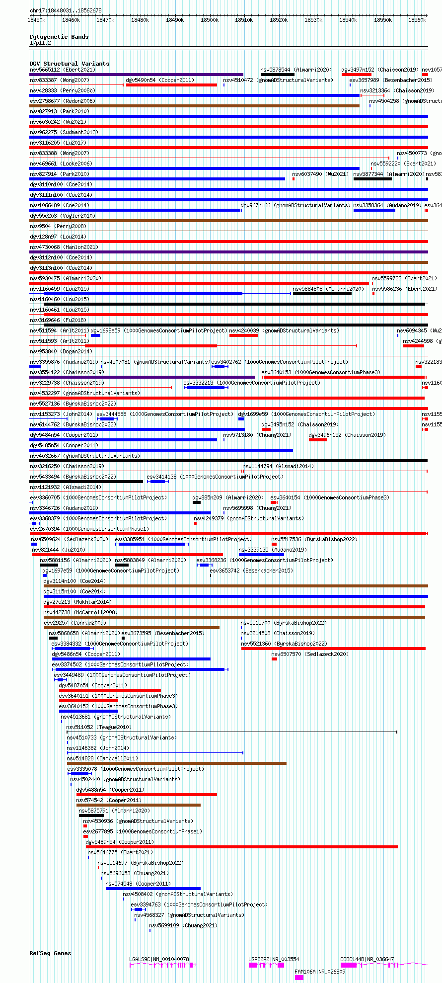 Variant DetailsVariant: esv2670394 | Internal ID | 9936499 | | Landmark | | | Location Information | | | Cytoband | 17p11.2 | | Allele length | | Assembly | Allele length | | hg38 | 114648 | | hg19 | 114648 |