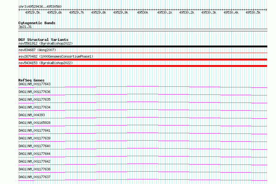 Variant DetailsVariant: esv2670482| Internal ID | 9936587 | | Landmark | | | Location Information | | | Cytoband | 3p21.31 | | Allele length | | Assembly | Allele length | | hg38 | 1125 | | hg19 | 1125 |