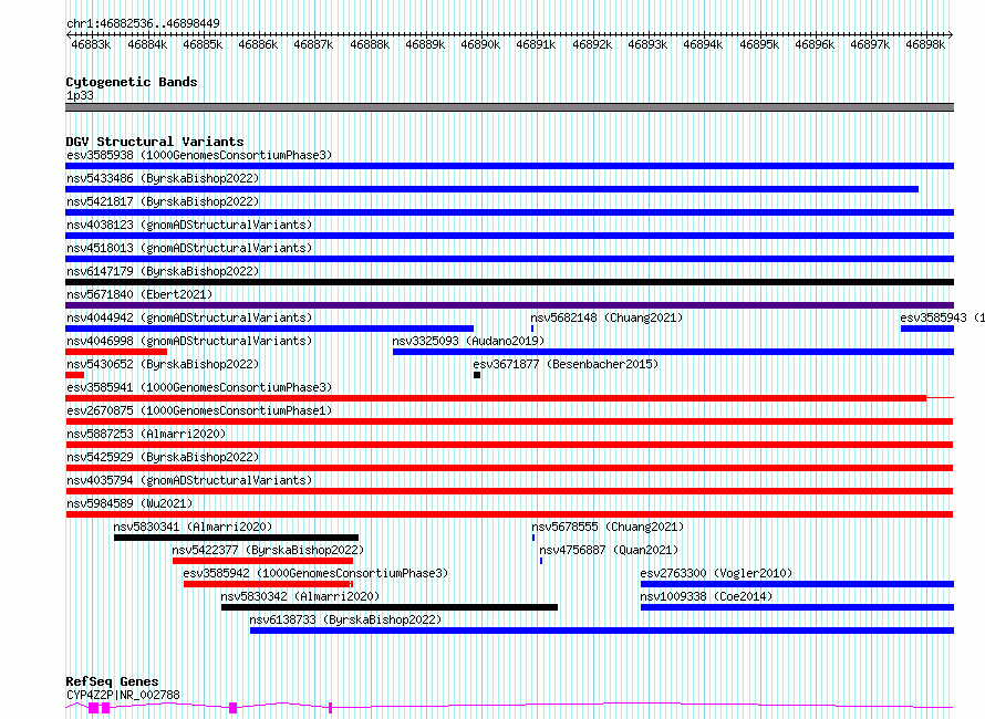 Variant DetailsVariant: esv2670875| Internal ID | 9936980 | | Landmark | | | Location Information | | | Cytoband | 1p33 | | Allele length | | Assembly | Allele length | | hg38 | 15914 | | hg19 | 15914 |