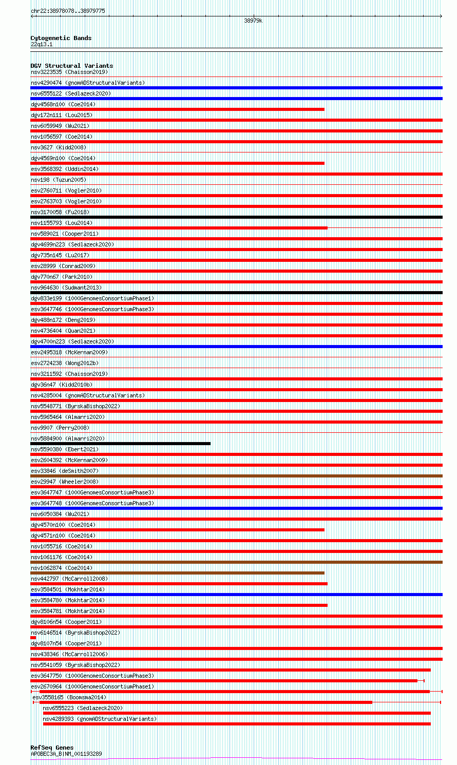Variant DetailsVariant: esv2670964| Internal ID | 9937069 | | Landmark | | | Location Information | | | Cytoband | 22q13.1 | | Allele length | | Assembly | Allele length | | hg38 | 1698 | | hg19 | 1698 |