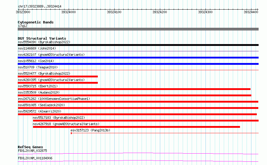 Variant DetailsVariant: esv2671262 | Internal ID | 9937367 | | Landmark | | | Location Information | | | Cytoband | 17q12 | | Allele length | | Assembly | Allele length | | hg38 | 526 | | hg19 | 526 |