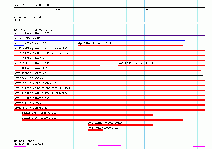 Variant DetailsVariant: esv2671329| Internal ID | 9937434 | | Landmark | | | Location Information | | | Cytoband | 6q21 | | Allele length | | Assembly | Allele length | | hg38 | 2150 | | hg19 | 2150 |