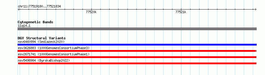 Variant DetailsVariant: esv2671741| Internal ID | 9937846 | | Landmark | | | Location Information | | | Cytoband | 11q14.1 | | Allele length | | Assembly | Allele length | | hg38 | 2655 | | hg19 | 2655 |