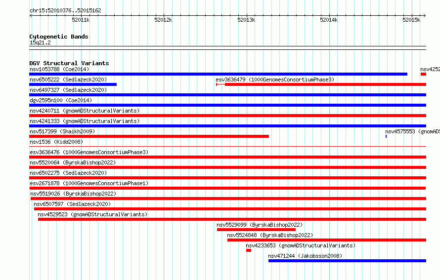 Variant DetailsVariant: esv2671878| Internal ID | 9937983 | | Landmark | | | Location Information | | | Cytoband | 15q21.2 | | Allele length | | Assembly | Allele length | | hg38 | 4787 | | hg19 | 4787 |