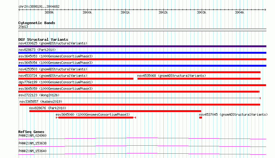 | | Variant Type | CNV deletion | | Copy Number | | | Allele State | | | Allele Origin | | | Probe Count | | | Validation Flag | | | Merged Status | M | | Merged Variants | dgv776e199 | | Supporting Variants | essv5451984, essv6545501 | | Samples | HG00268, NA19726 | | Known Genes | PANK2 | | Method | Merging | | Analysis | No reference, merging analysis | | Platform | Merging | | Comments | High quality site | | Reference | 1000_Genomes_Consortium_Phase_1 | | Pubmed ID | 23128226 | | Accession Number(s) | esv2672145