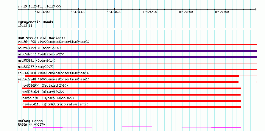 Variant DetailsVariant: esv2672248| Internal ID | 9938353 | | Landmark | | | Location Information | | | Cytoband | 19p13.12 | | Allele length | | Assembly | Allele length | | hg38 | 665 | | hg19 | 665 |