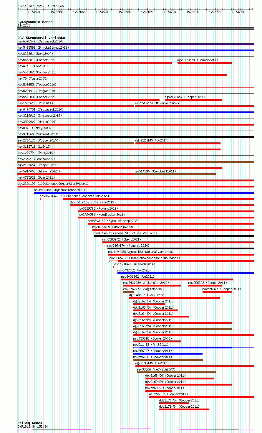 Variant DetailsVariant: esv2672284 | Internal ID | 9938389 | | Landmark | | | Location Information | | | Cytoband | 11q22.3 | | Allele length | | Assembly | Allele length | | hg38 | 10398 | | hg19 | 10398 |