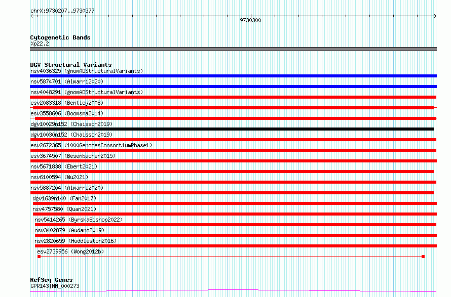 Variant DetailsVariant: esv2672365 | Internal ID | 9938470 | | Landmark | | | Location Information | | | Cytoband | Xp22.2 | | Allele length | | Assembly | Allele length | | hg38 | 171 | | hg19 | 171 |