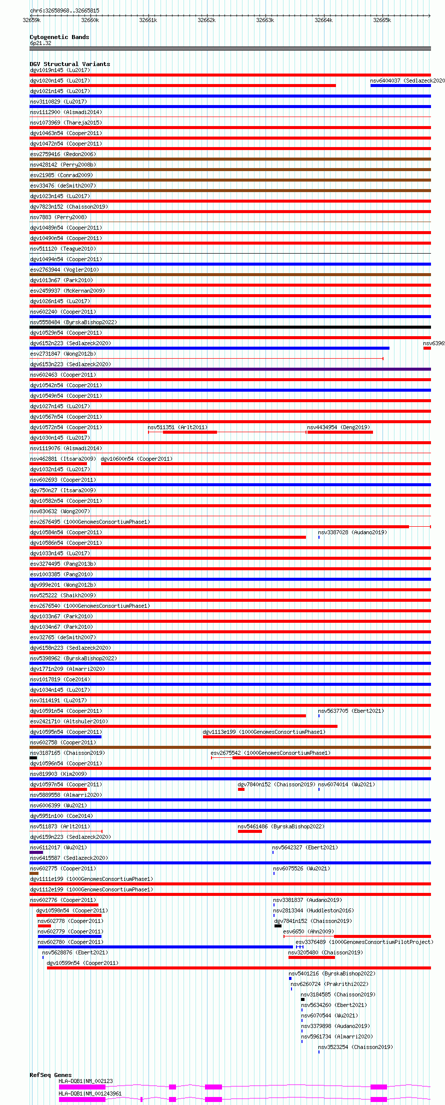 Variant DetailsVariant: esv2672407 | Internal ID | 9938512 | | Landmark | | | Location Information | | | Cytoband | 6p21.32 | | Allele length | | Assembly | Allele length | | hg38 | 6848 | | hg19 | 6848 |