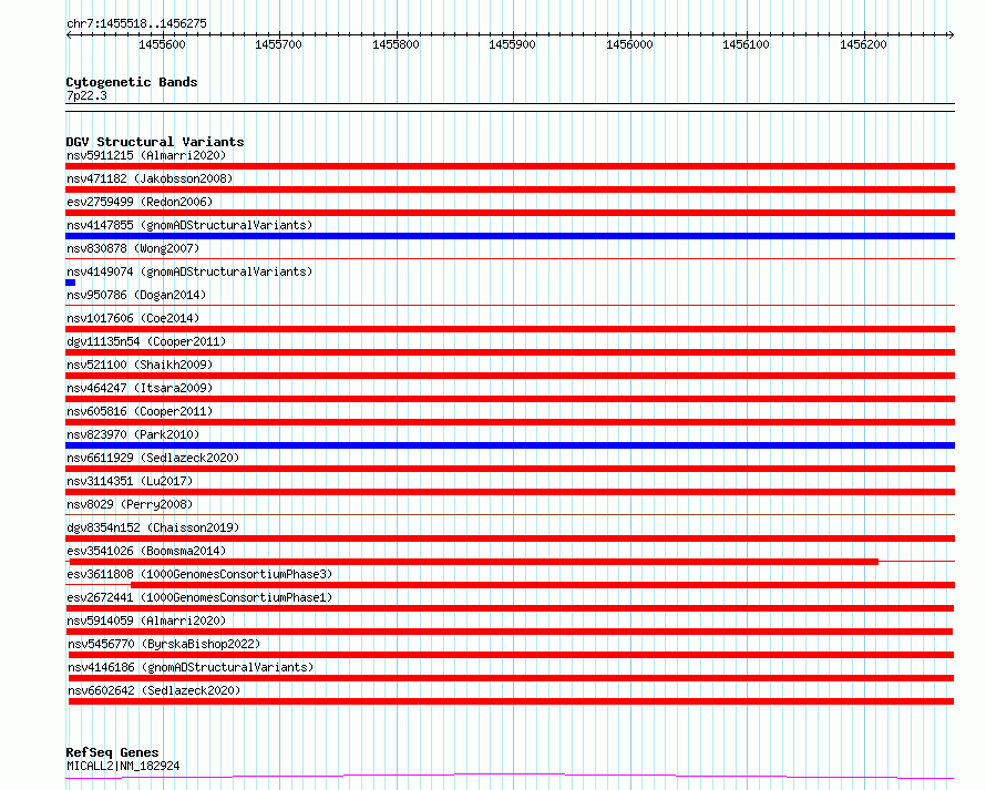 Variant DetailsVariant: esv2672441| Internal ID | 9938546 | | Landmark | | | Location Information | | | Cytoband | 7p22.3 | | Allele length | | Assembly | Allele length | | hg38 | 758 | | hg19 | 758 |