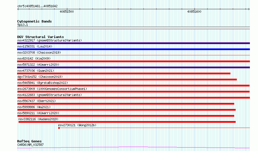 Variant DetailsVariant: esv2673909| Internal ID | 9940014 | | Landmark | | | Location Information | | | Cytoband | 5p13.1 | | Allele length | | Assembly | Allele length | | hg38 | 182 | | hg19 | 182 |