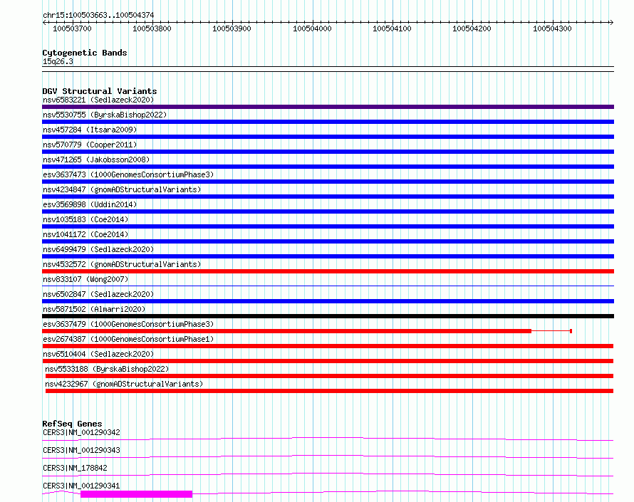 Variant DetailsVariant: esv2674387| Internal ID | 9940492 | | Landmark | | | Location Information | | | Cytoband | 15q26.3 | | Allele length | | Assembly | Allele length | | hg38 | 712 | | hg19 | 712 |