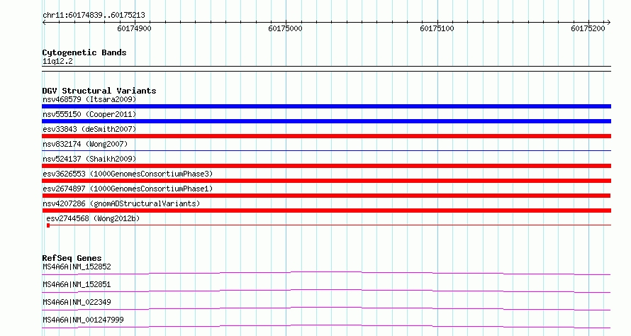 | | Variant Type | CNV deletion | | Copy Number | | | Allele State | | | Allele Origin | | | Probe Count | | | Validation Flag | | | Merged Status | M | | Merged Variants | | | Supporting Variants | essv5781933, essv5428330, essv5430071, essv6513474, essv5966547, essv5641604, essv6015604, essv5683646, essv5673349, essv6581262, essv6313119, essv6044681, essv5998859, essv6085789, essv6522068 | | Samples | NA19746, NA18567, NA19731, NA18638, HG01136, NA19056, NA18630, HG00525, NA18963, NA18943, HG00672, NA19726, HG01377, HG00595, HG01125 | | Known Genes | MS4A6A | | Method | Merging | | Analysis | No reference, merging analysis | | Platform | Merging | | Comments | High quality site | | Reference | 1000_Genomes_Consortium_Phase_1 | | Pubmed ID | 23128226 | | Accession Number(s) | esv2674897