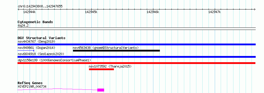 Variant DetailsVariant: esv2674945 | Internal ID | 9941050 | | Landmark | | | Location Information | | | Cytoband | 6q24.2 | | Allele length | | Assembly | Allele length | | hg38 | 3848 | | hg19 | 3848 |