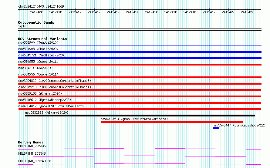 | | Variant Type | CNV deletion | | Copy Number | | | Allele State | | | Allele Origin | | | Probe Count | | | Validation Flag | | | Merged Status | M | | Merged Variants | | | Supporting Variants | essv5596408, essv6394367 | | Samples | HG01048, NA12778 | | Known Genes | HDLBP | | Method | Merging | | Analysis | No reference, merging analysis | | Platform | Merging | | Comments | High quality site | | Reference | 1000_Genomes_Consortium_Phase_1 | | Pubmed ID | 23128226 | | Accession Number(s) | esv2675219