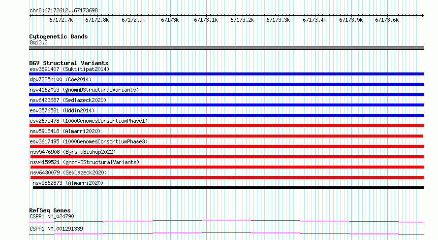 Variant DetailsVariant: esv2675478| Internal ID | 9941583 | | Landmark | | | Location Information | | | Cytoband | 8q13.2 | | Allele length | | Assembly | Allele length | | hg38 | 1087 | | hg19 | 1087 |
