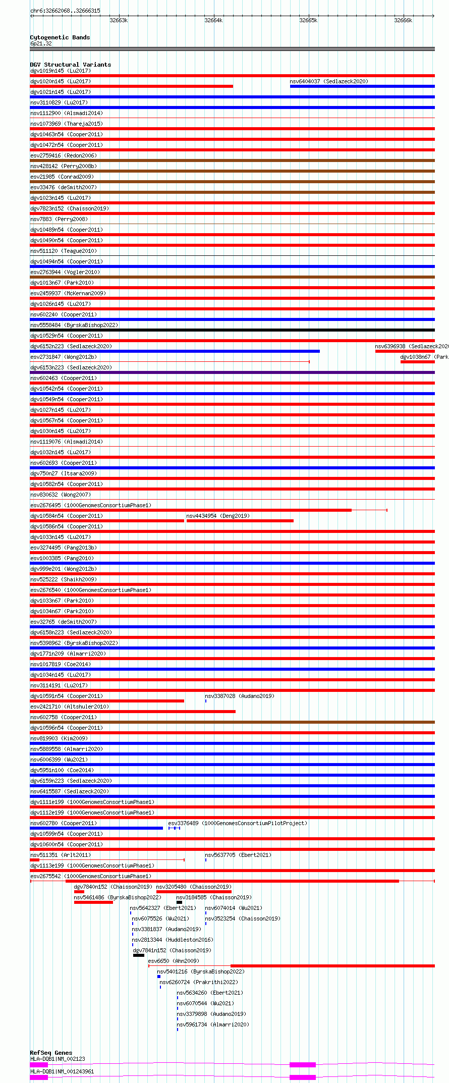 Variant DetailsVariant: esv2675542 | Internal ID | 9941647 | | Landmark | | | Location Information | | | Cytoband | 6p21.32 | | Allele length | | Assembly | Allele length | | hg38 | 4248 | | hg19 | 4248 |
