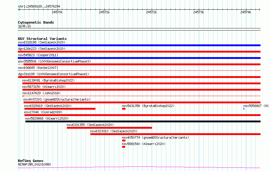 Variant DetailsVariant: esv2675930| Internal ID | 9942035 | | Landmark | | | Location Information | | | Cytoband | 1p36.11 | | Allele length | | Assembly | Allele length | | hg38 | 5126 | | hg19 | 5126 |