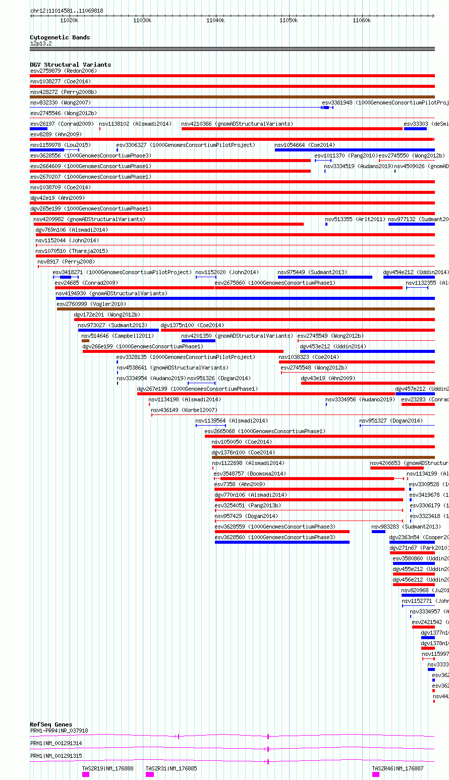 Variant DetailsVariant: esv2676132| Internal ID | 9595551 | | Landmark | | | Location Information | | | Cytoband | 12p13.2 | | Allele length | | Assembly | Allele length | | hg38 | 55238 | | hg19 | 55238 |