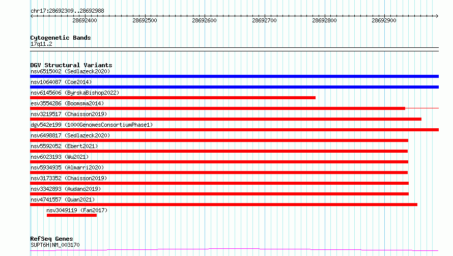 Variant DetailsVariant: esv2676161 | Internal ID | 9942266 | | Landmark | | | Location Information | | | Cytoband | 17q11.2 | | Allele length | | Assembly | Allele length | | hg38 | 680 | | hg19 | 680 |