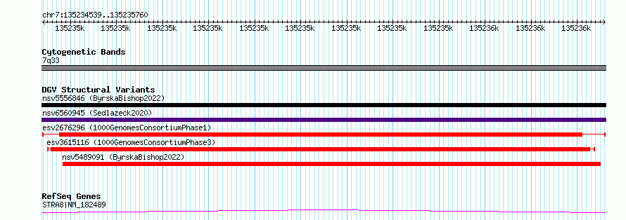| | Variant Type | CNV deletion | | Copy Number | | | Allele State | | | Allele Origin | | | Probe Count | | | Validation Flag | | | Merged Status | M | | Merged Variants | | | Supporting Variants | essv5960354, essv6367274 | | Samples | NA19375, NA19376 | | Known Genes | STRA8 | | Method | Merging | | Analysis | No reference, merging analysis | | Platform | Merging | | Comments | High quality site | | Reference | 1000_Genomes_Consortium_Phase_1 | | Pubmed ID | 23128226 | | Accession Number(s) | esv2676296
