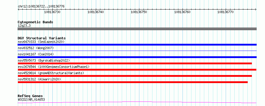 Variant DetailsVariant: esv2676544| Internal ID | 9942649 | | Landmark | | | Location Information | | | Cytoband | 12q23.3 | | Allele length | | Assembly | Allele length | | hg38 | 55 | | hg19 | 55 |