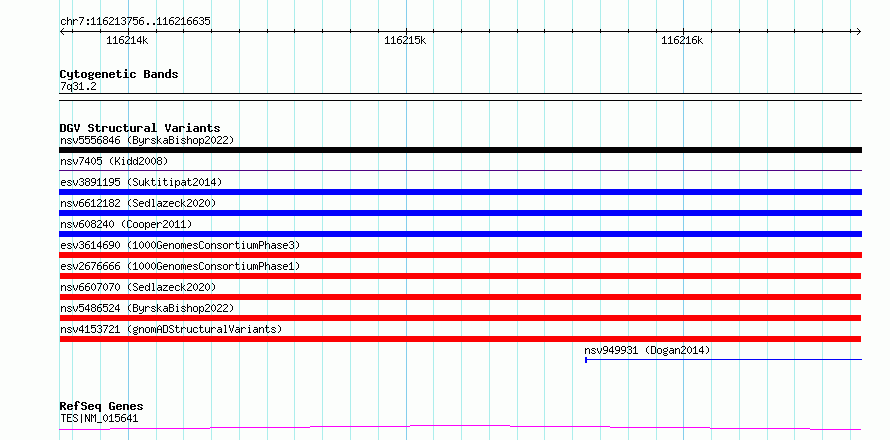 Variant DetailsVariant: esv2676666| Internal ID | 9942771 | | Landmark | | | Location Information | | | Cytoband | 7q31.2 | | Allele length | | Assembly | Allele length | | hg38 | 2880 | | hg19 | 2880 |