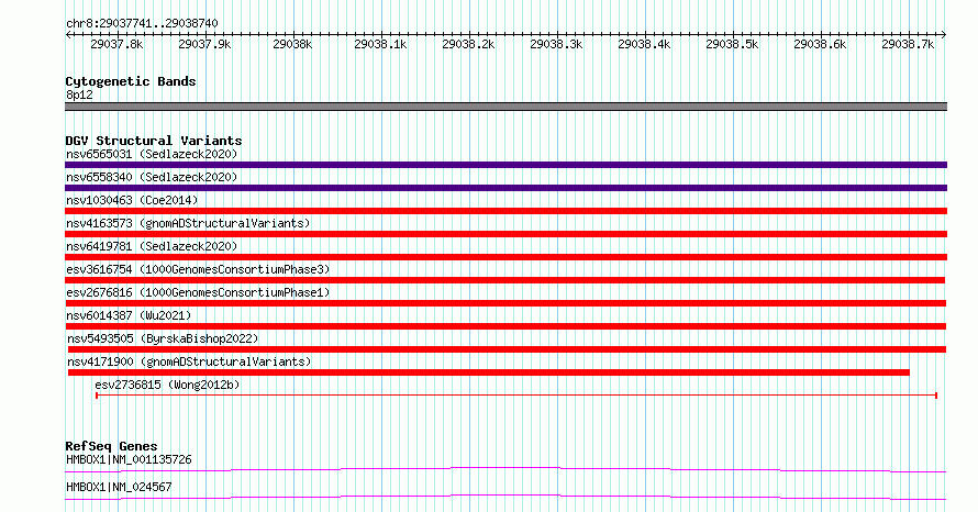Variant DetailsVariant: esv2676816| Internal ID | 9942921 | | Landmark | | | Location Information | | | Cytoband | 8p12 | | Allele length | | Assembly | Allele length | | hg38 | 1000 | | hg19 | 1000 |