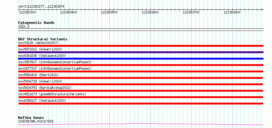 Variant DetailsVariant: esv2677337| Internal ID | 9943442 | | Landmark | | | Location Information | | | Cytoband | 3q21.1 | | Allele length | | Assembly | Allele length | | hg38 | 598 | | hg19 | 598 |