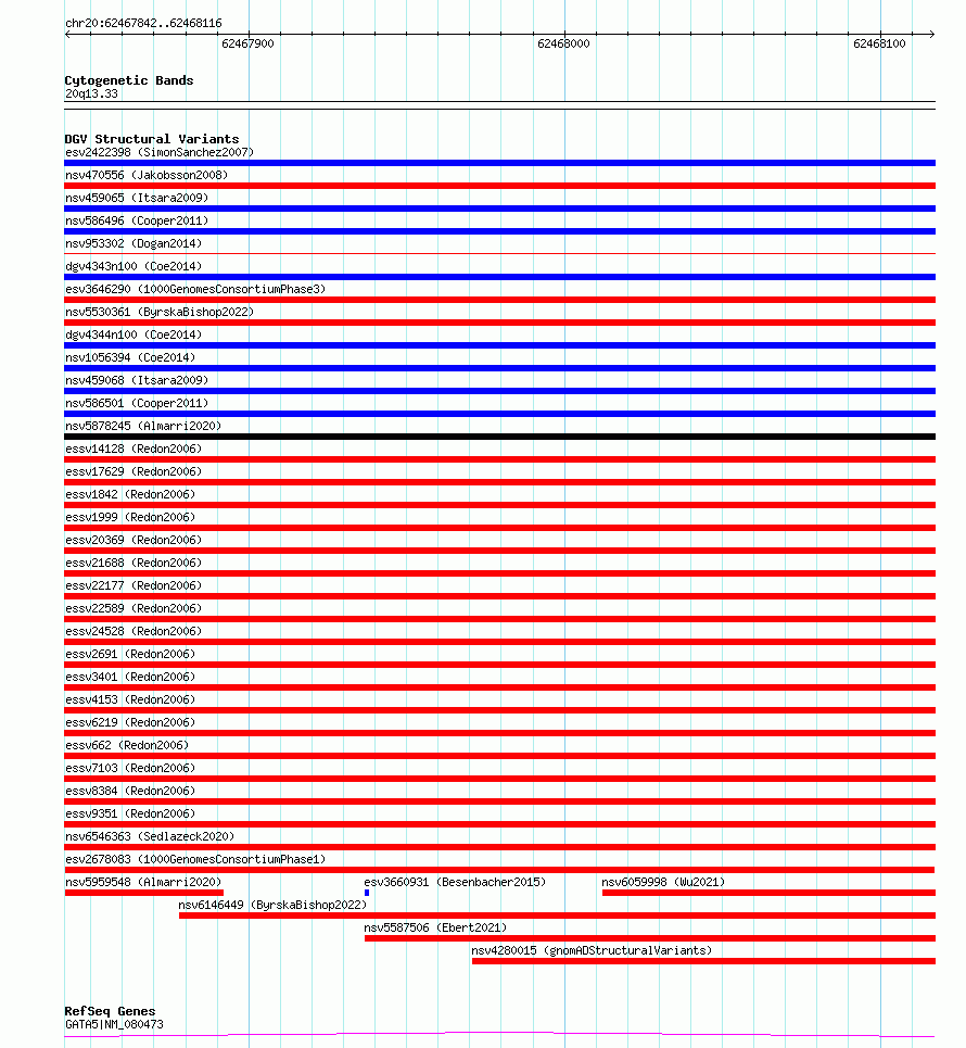 Variant DetailsVariant: esv2678083| Internal ID | 9944188 | | Landmark | | | Location Information | | | Cytoband | 20q13.33 | | Allele length | | Assembly | Allele length | | hg38 | 275 | | hg19 | 275 |