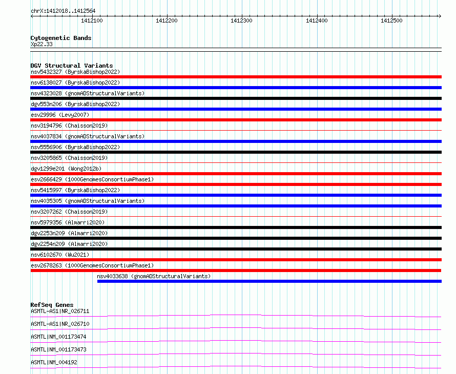 Variant DetailsVariant: esv2678263 | Internal ID | 9944368 | | Landmark | | | Location Information | | | Cytoband | Xp22.33 | | Allele length | | Assembly | Allele length | | hg38 | 547 | | hg19 | 547 |