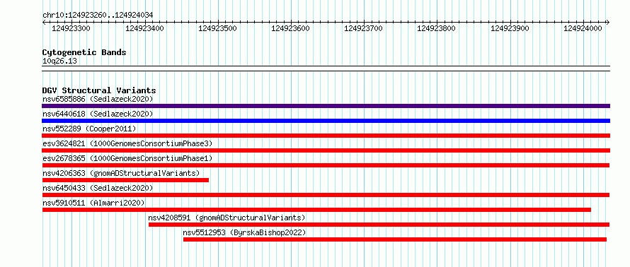 Variant DetailsVariant: esv2678365| Internal ID | 9944470 | | Landmark | | | Location Information | | | Cytoband | 10q26.13 | | Allele length | | Assembly | Allele length | | hg38 | 775 | | hg19 | 775 |