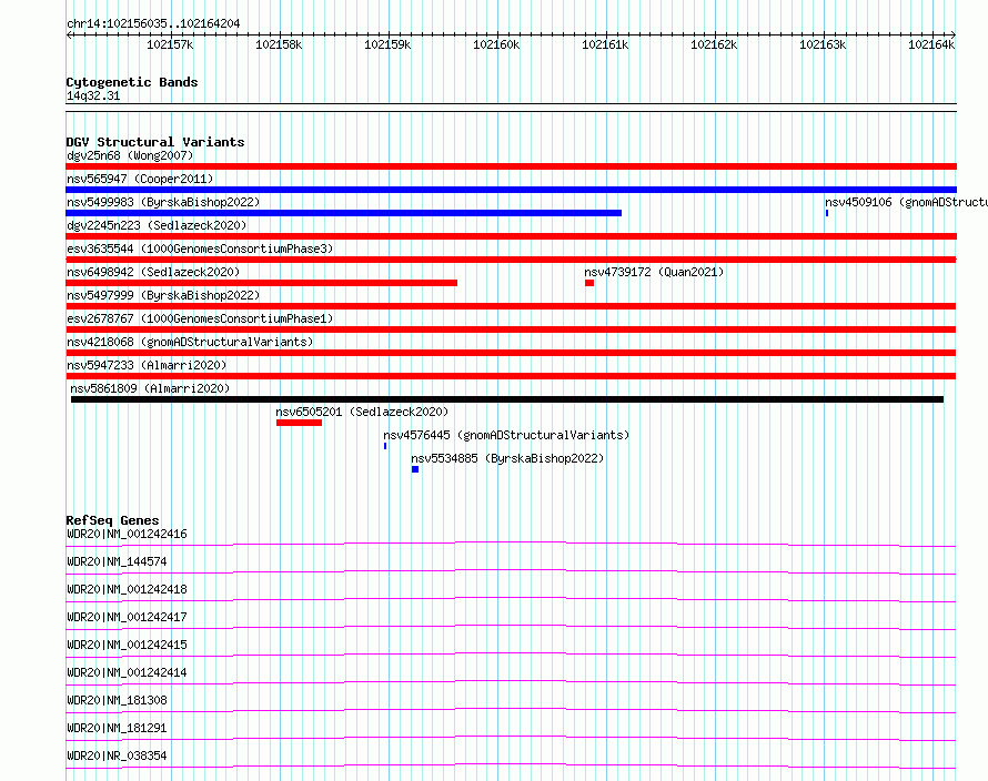 Variant DetailsVariant: esv2678767| Internal ID | 9944872 | | Landmark | | | Location Information | | | Cytoband | 14q32.31 | | Allele length | | Assembly | Allele length | | hg38 | 8170 | | hg19 | 8170 |